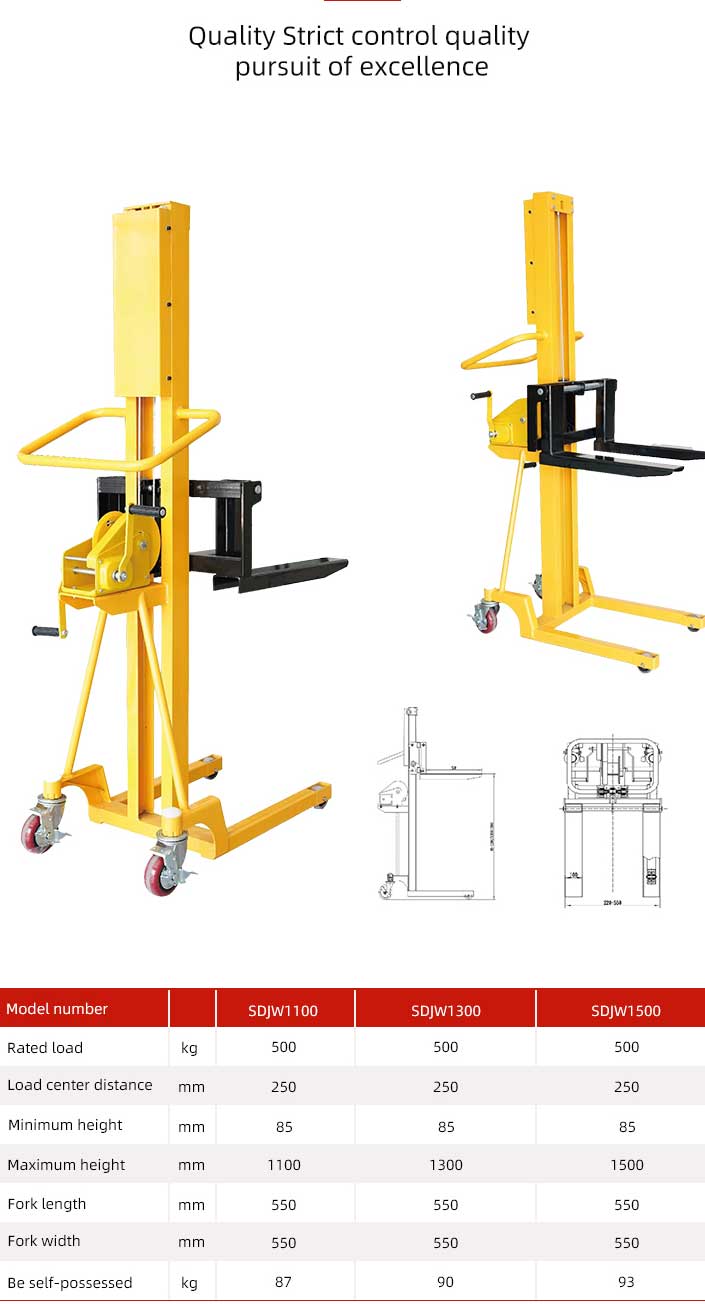 500kg manibus grabatum stakcer Per rotating in manu fabrica, in operante agit internum mechanica structuram tollere vel inferioribus cargo furca, ita consequi stacking operationem in tanquam.